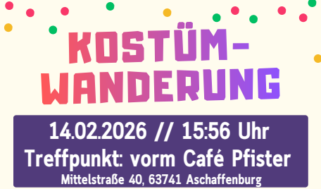 2026 treffen wir uns zur Kostümwanderung am Samstag, 14.02.2026 um 15:56 Uhr vorm Café Pfister, Mittelstraße 40, 63741 AschaffenburgLudwig freut […]